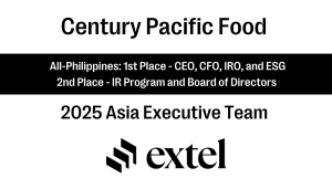 Century Pacific Food, Inc. (PSE:CNPF), a leading food and beverage manufacturing company in the Philippines, has ranked in Extel’s Asia Executive Team (Ex-China and Japan) Survey over the years as one of the top consumer staples companies in the region. This year, CNPF was once again recognized as a Most Honored Company – one of the 47 companies to earn this distinction among the 998 nominees, based on votes from 2,909 participating portfolio managers and analysts.