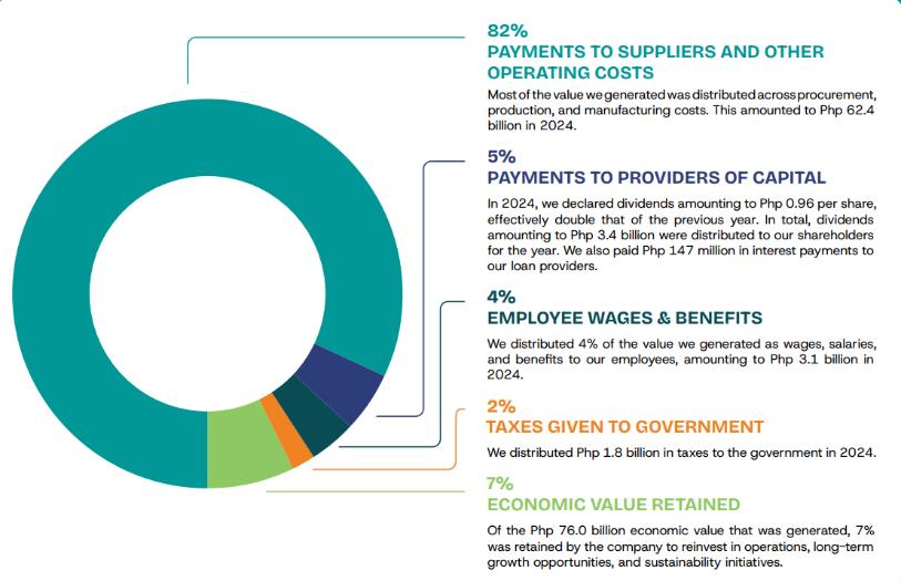 Of the Php 76.0 billion economic value that was generated, 7% was retained by the company to reinvest in operations, long-term growth opportunities, and sustainability initiatives.