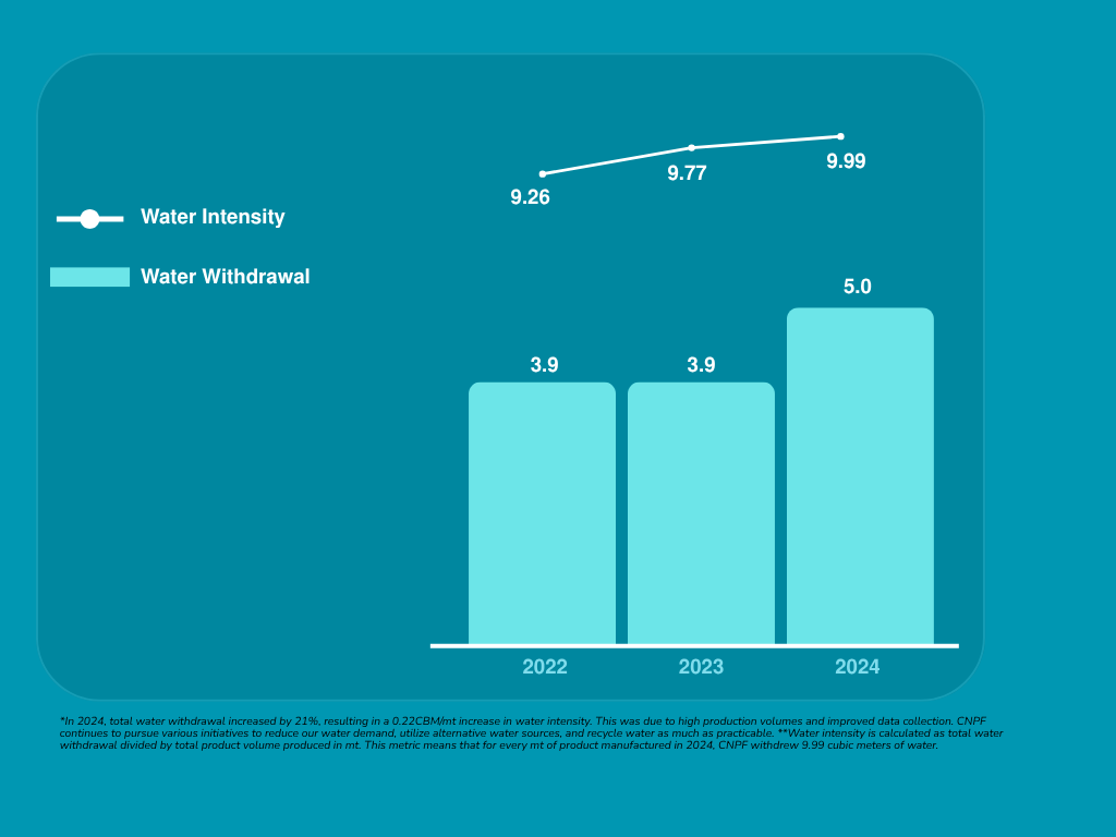 In 2024, total water withdrawal increased by 21%, resulting in a 0.22CBM/mt increase in water intensity. This was due to high production volumes and improved data collection. CNPF continues to pursue various initiatives to reduce our water demand, utilize alternative water sources, and recycle water as much as practicable.