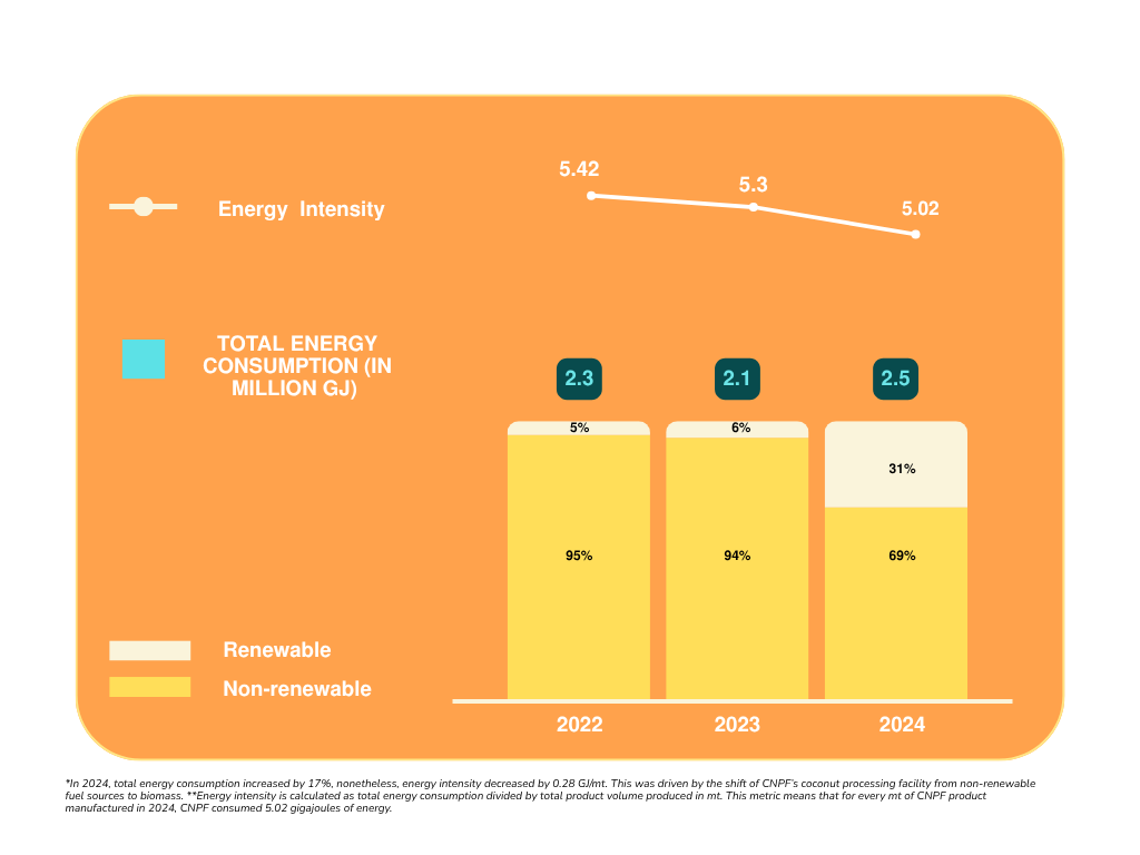 In 2024, total energy consumption increased by 17%, nonetheless, energy intensity decreased by 0.28 GJ/mt. This was driven by the shift of CNPF’s coconut processing facility from non-renewable fuel sources to biomass.