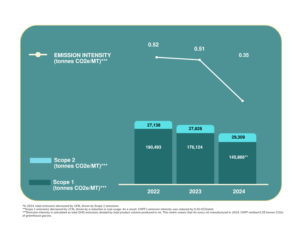 Energy intensity is calculated as total energy consumption divided by total product volume produced in mt. This metric means that for every mt of CNPF product manufactured in 2024, CNPF consumed 5.02 gigajoules of energy.